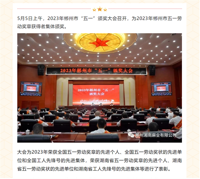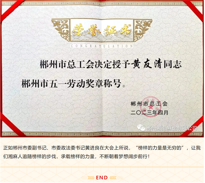 喜報(bào)丨郴州湘南麻業(yè)黃友清同志榮獲“郴州市五一勞動(dòng)獎(jiǎng)?wù)隆惫鈽s稱(chēng)號(hào)